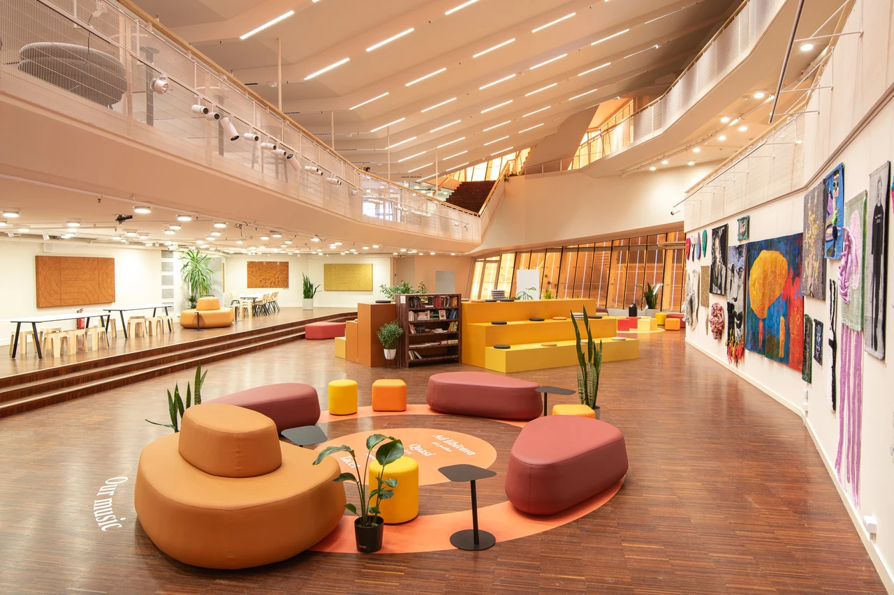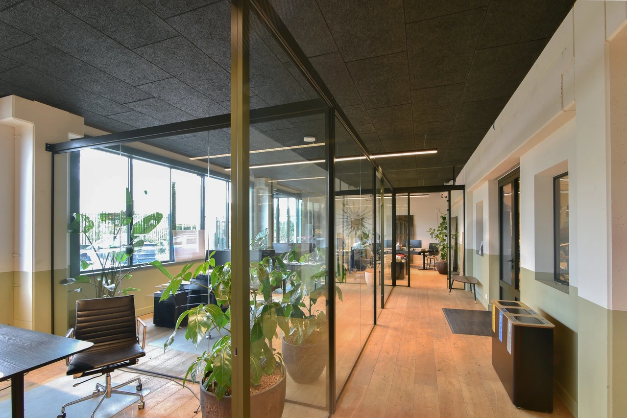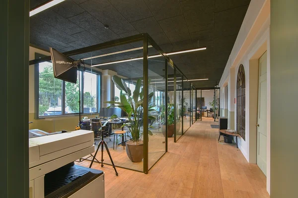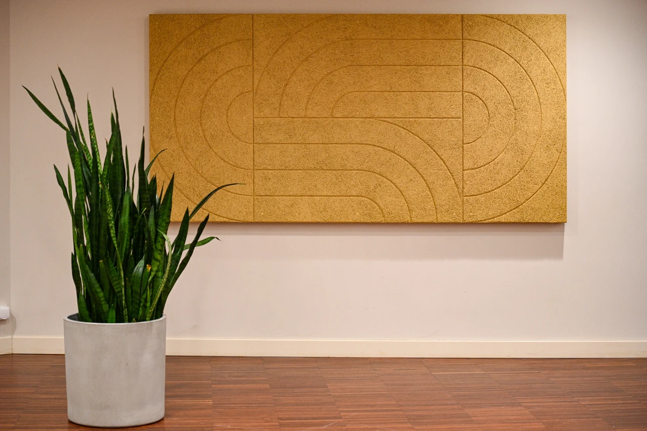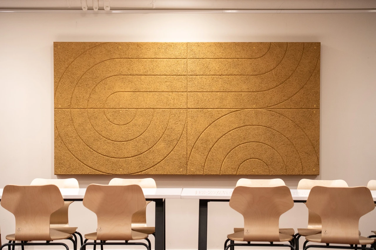 Apdrukātas akustiskās plātnes sienu apdarē birojā