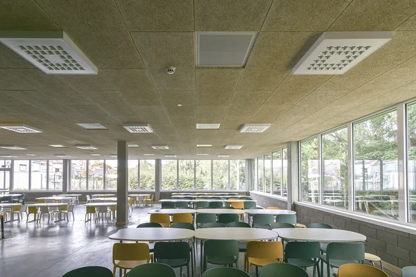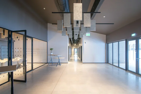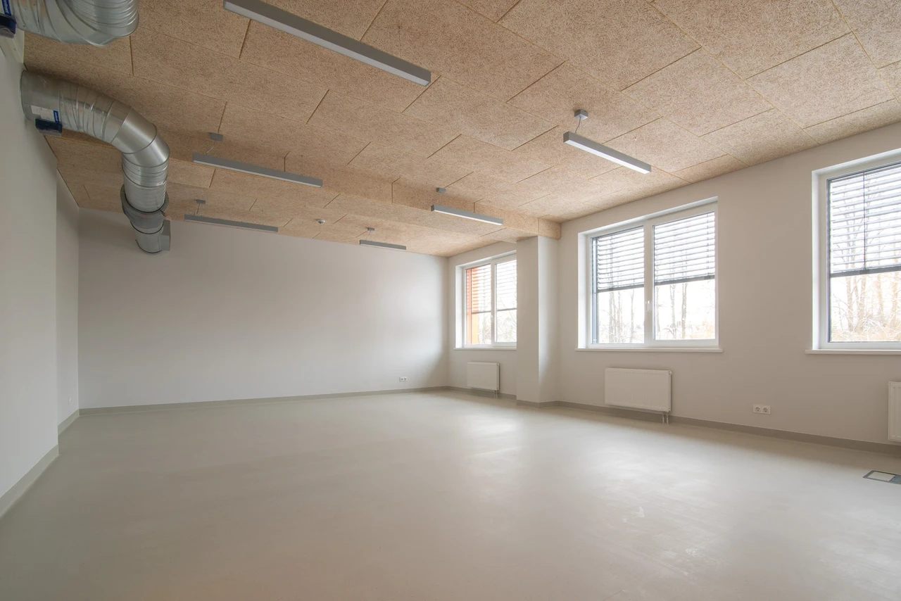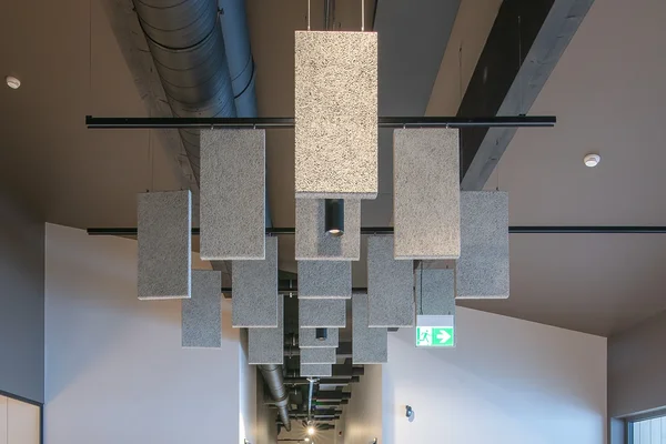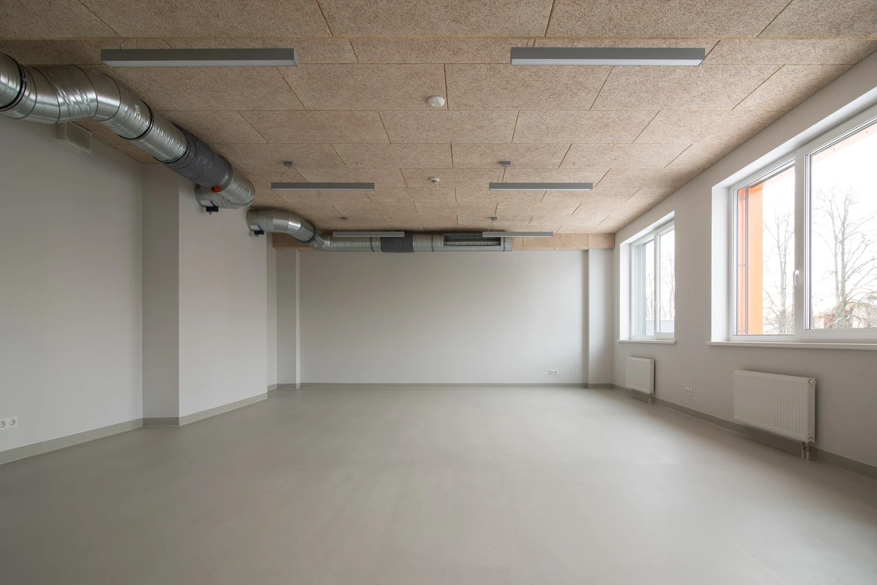 Birojs Anykščia ar Baffle risinājumu Latvijas Leļļu teātris Privātmāja Viļņā Rūpnīcas komplekss Kauņā Better Bread beķereja Rīgas Vēstures un kuģniecības muzejs Linde Grupa Kuldīgā Tenax biroja jaunceltne Kāpņu telpa dzīvokļu ēkā Norvēģijā Konferenču zālē Thon Hotell Snø, Oslo
